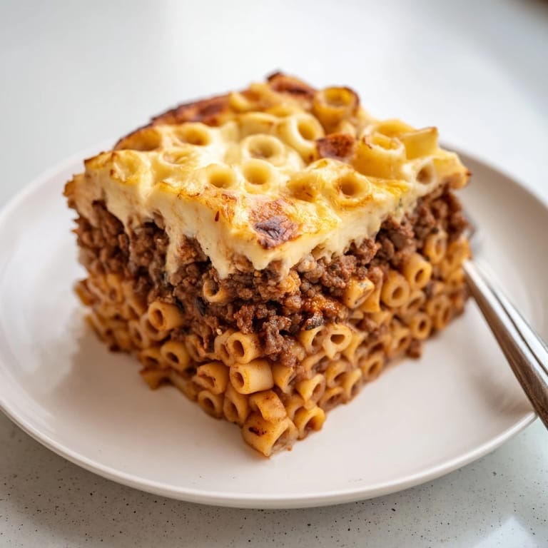 Save A classic Greek casserole featuring layers of tubular pasta, savory spiced beef, and creamy béchamel sauce, baked to golden perfection.