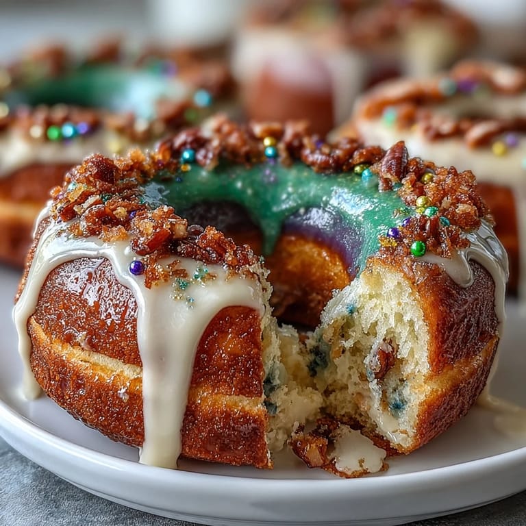 - Sprinkle each donut in stripes or sections—green on one third, purple on another, gold on the last—just like a King Cake, which makes them festive and photograph-worthy. Let the glaze set for about 15 minutes before serving so the colors don't blur together.