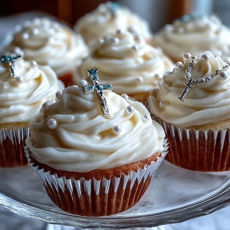 Save My sister called me three weeks before her daughter's First Communion in a mild panic—she wanted something special but didn't have time for elaborate desserts. I found myself at the kitchen table with fondant, food coloring, and tiny cupcake liners, thinking about how celebration cakes don't always have to be complicated. These miniature vanilla cupcakes with their delicate rosary toppers became exactly what she needed: elegant enough to photograph, small enough that guests could enjoy more than one without guilt, and meaningful in a way that felt personal rather than store-bought.