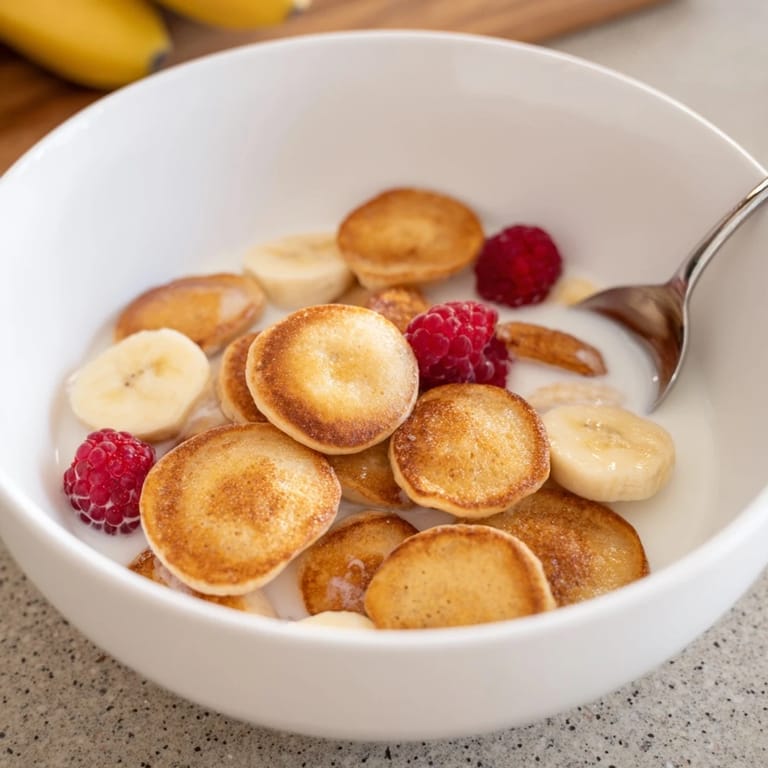 Save Adorable, bite-sized pancakes served like breakfast cereal, crispy on the outside, fluffy inside, and perfect with milk, syrup, or fruit.