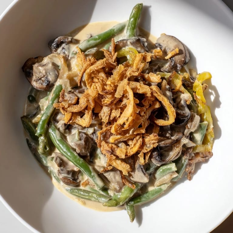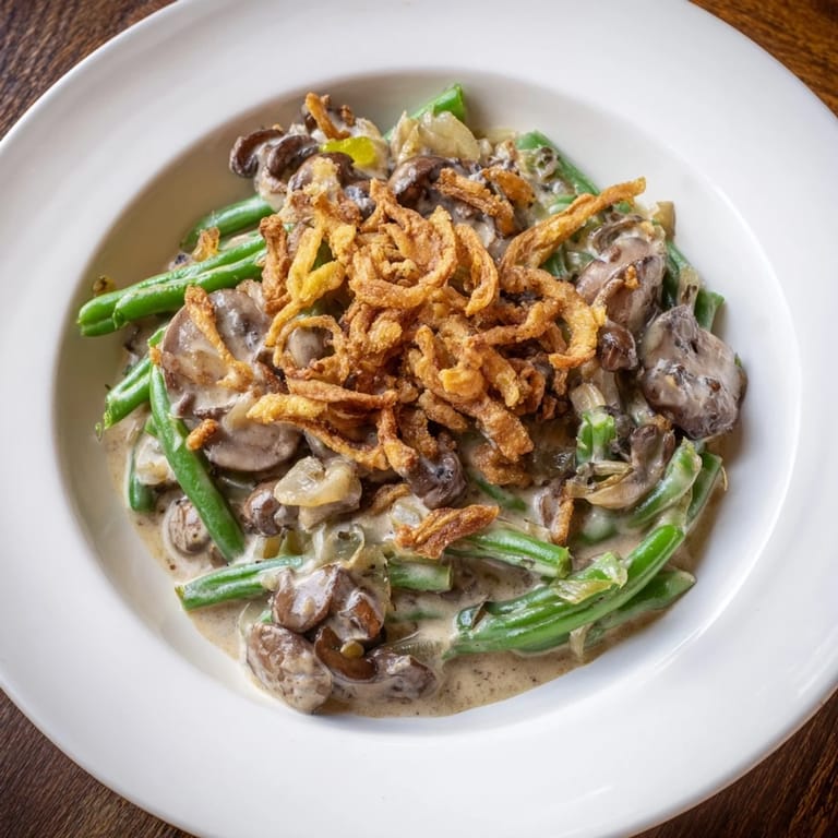 Save A nostalgic, creamy side dish featuring tender green beans, savory mushrooms, and crispy fried onions—a classic for holiday feasts and family dinners.