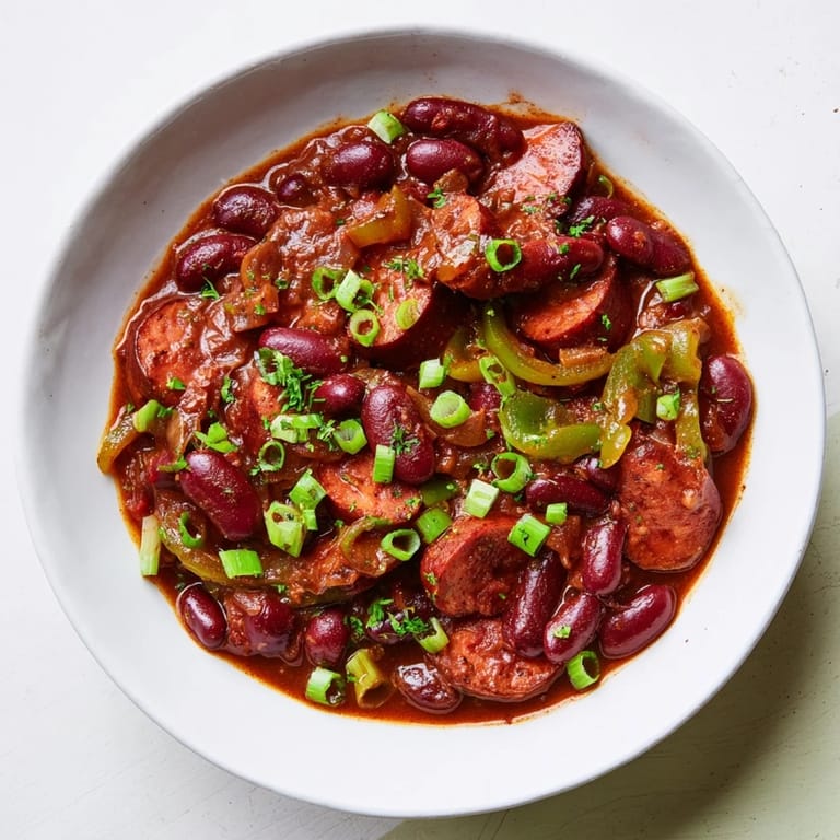 Save A classic Creole dish featuring tender red beans simmered with smoky sausage and aromatic vegetables, served over fluffy white rice. Hearty, flavorful, and perfect for a comforting meal.