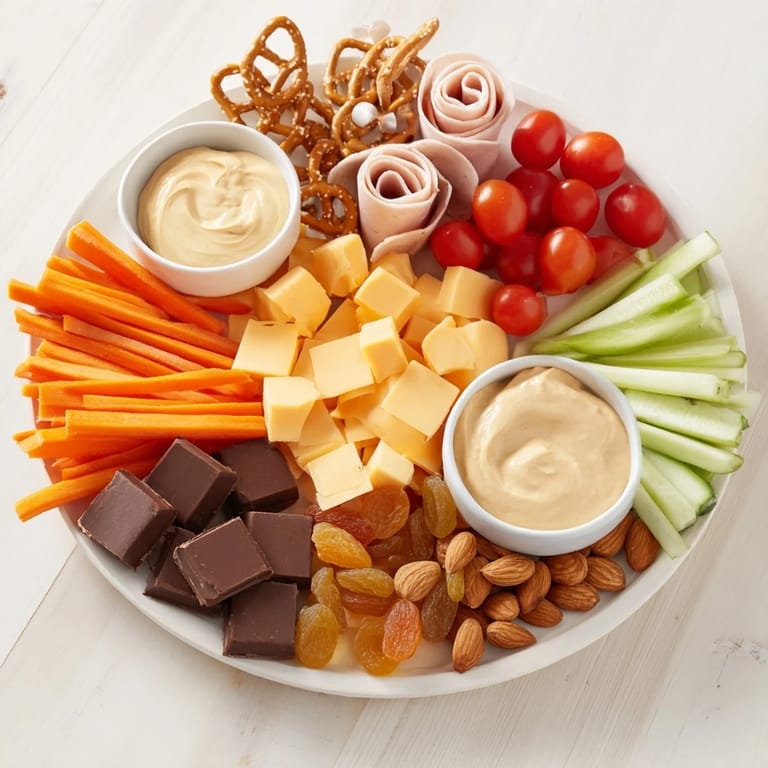 - Savory Bites: 100 g mini pretzels, 80 g cheddar cheese cubes, 80 g gouda cheese cubes, 80 g smoked turkey slices rolled (optional), 1 medium carrot peeled and sliced into sticks, 1 cucumber sliced into rounds, 80 g cherry tomatoes
