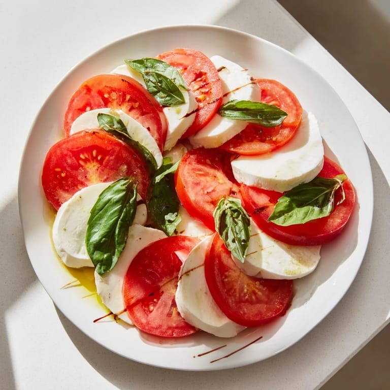 Save A fresh and vibrant brunch side featuring juicy tomatoes and creamy mozzarella, finished with fragrant basil and a drizzle of olive oil.