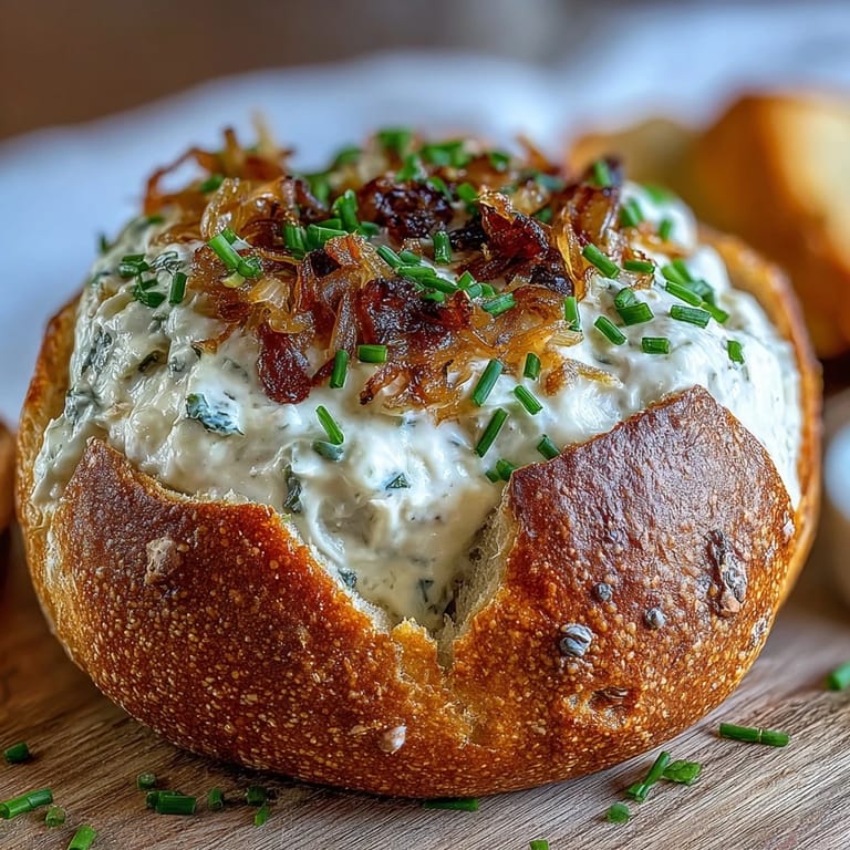 Save There's something magical about watching a bread bowl materialize on your counter—hollowed out, waiting to be filled with something golden and creamy. My neighbor Sarah showed up to a potluck with this years ago, and the way people gravitated toward it felt less like eating and more like gathering around warmth. The sourdough crust holds its shape beautifully while the onions inside have caramelized into something almost sweet, almost savory, completely irresistible. Since then, I've made it countless times, and it never fails to be the first thing to disappear.