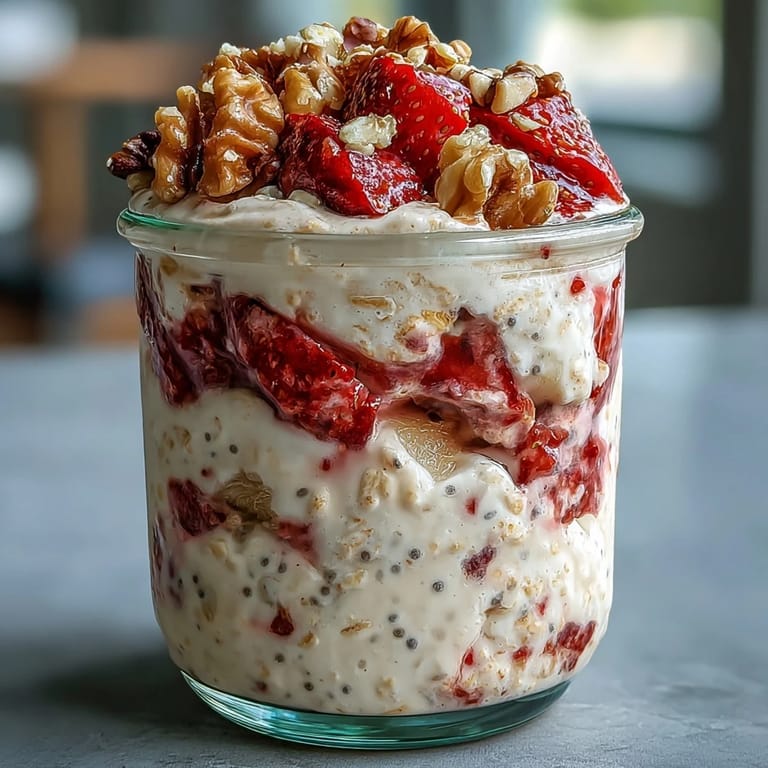 - Divide between bowls or keep in your jar, then crown it with fresh strawberries, banana slices, extra walnuts, and a drizzle of honey if you're feeling fancy. Eat straight from the fridge while it's still cold.
