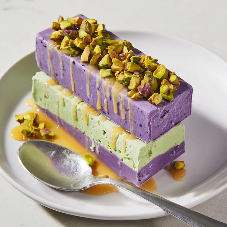 Save Creamy vibrant ice cream bars featuring sweet ube and nutty pistachio layered for a delightful contrast in flavor and color. Perfect for a refreshing summer dessert or an impressive treat for gatherings.
