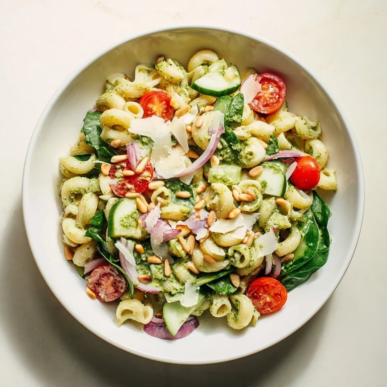 A vibrant pasta salad that combines the creamy tang of Caesar dressing with fresh basil pesto, tossed with ditalini pasta, crisp vegetables, and savory Parmesan for a flavorful, crowd-pleasing dish.