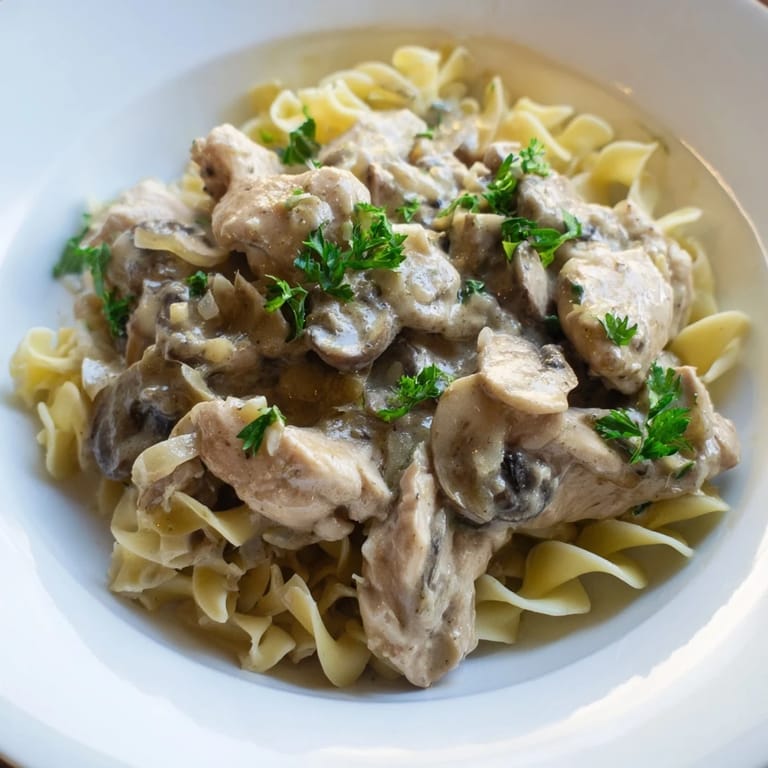 Save A comforting and flavorful dish featuring tender chicken in a rich, creamy mushroom sauce, perfect over noodles or rice.