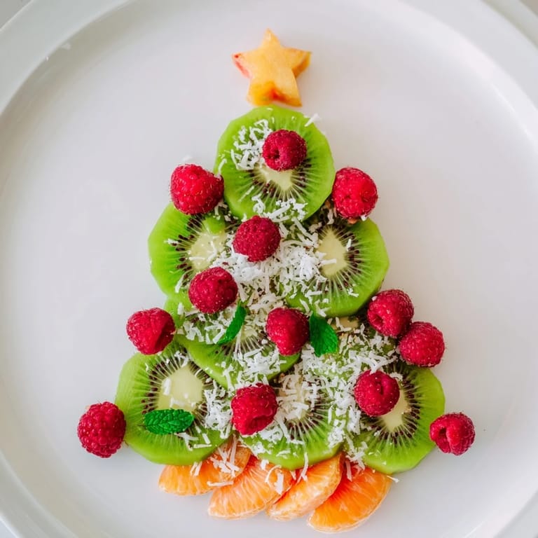 Save A festive and vibrant fruit platter shaped like a Christmas tree, featuring fresh kiwi slices and raspberries for a healthy, eye-catching holiday treat.